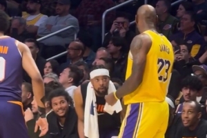 上赛季曾并肩作战!詹姆斯在场上和场边的古德温聊天