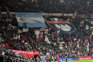 在死忠看台,一众曼联球迷打出大幅tifo表达对利马的支持,将阿根廷国旗里的太阳替换为了菜刀…