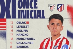 马竞首发:13-奥布拉克、15-朗格莱、16-莫利纳、17-汉茨科、18-普比尔、4-加拉格尔、8-巴勃罗·巴里奥斯、20-朱利亚诺·西蒙尼、23-尼古拉斯·冈萨雷斯、11-阿尔马达、19-阿尔瓦雷斯