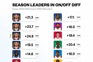 04年后单赛季在场/不在场百回合净胜分:约基奇前4 保罗多次上榜
