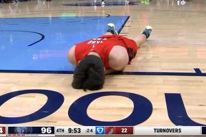 杨瀚森遭遇包夹被埃迪打到面部痛苦倒地 在地上躺了半天没起来