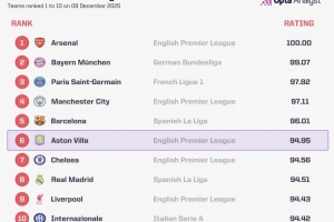 体育资讯12月9日讯 Opta列出了全球俱乐部竞技实力实时排名,阿森纳居首,拜仁、巴黎二三位,维拉升至第6位。