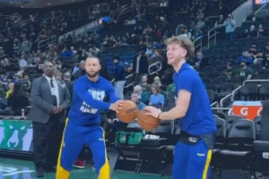 赛前热身环节,库里和波杰姆斯基再次祭出经典热身动作。两人碰球后一起出手先后命中三分,随后他们开心地撞胸庆祝。