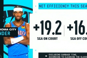 夸张!本赛季SGA在场雷霆百回合净胜19.2分 下场后仍净胜16.2分