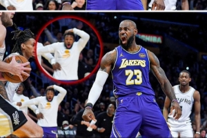 詹姆斯惊天隔扣科内特 场边的布朗尼被惊出表情包😱