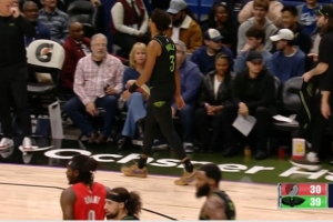 望无大碍!普尔追身三分命中 但后退时踩到替补席摔倒有些崴脚