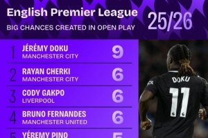 体育资讯12月12日讯 Squawka统计了本赛季英超球员联赛运动战创造重大机会的次数,并列出榜单,多库9次居首。