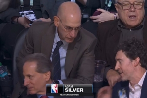 又在讨论什么呢?萧华观战尼克斯&魔术比赛 与邻座低头交流