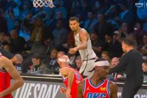 你防不住我!文班面对卡鲁索打进中距离 然后手指着对手振振有词