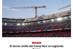 《阿斯报》表示,诺坎普球场的第三层看台正在建设中,侧门和南门区域的工程进展顺利,预制混凝土板正在安装中。新的看台将比之前的看台更高更陡,预计将于2026-27赛季完工,顶棚将于2027年底至2028年初之间完成,该球场翻新后预计可容纳约10.5万名观众。