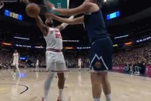 聪明死你了!约基奇球快发不出来了 直接砸奥科吉胳膊上出界