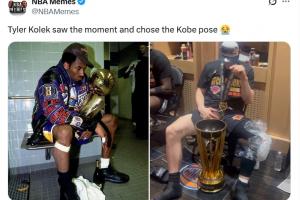 致敬传奇🫡!尼克斯二轮秀科勒克模仿科比的姿势与冠军奖杯合影