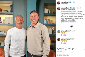 罗马里奥在社媒写道:“刚刚采访了06年意大利队世界杯冠军成员、最佳球员、06年世界足球先生、前足坛最顶尖的后卫法比奥·卡纳瓦罗。深感荣幸。”