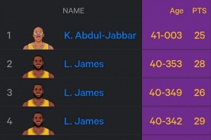 历史最老25+榜:詹姆斯40岁353天第二 仅次于41岁零3天的贾巴尔