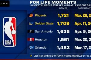 球队连续有3分进账场次:太阳1721场第一 勇士1709场第二