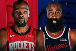 赛前NBA官方晒出海报,写道:“凯文·杜兰特(历史得分榜第8位)将率领火箭队前往洛杉矶,挑战詹姆斯·哈登(历史得分榜第10位)和快船队。”