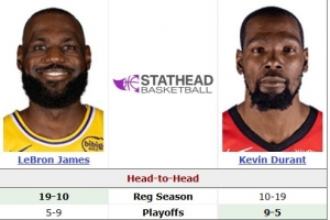 在此前常规赛交手中,詹姆斯战绩为19胜10负,期间詹姆斯场均轰26.2分7.2篮板7.2助攻,杜兰特场均可以得到28.6分6.8篮板4.1助攻。
