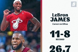 詹姆斯、杜兰特和库里都将在圣诞夜出战,他们三人生涯圣诞大战的战绩和数据如下: