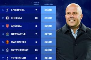 1.利物浦:4.83亿欧,引进7人