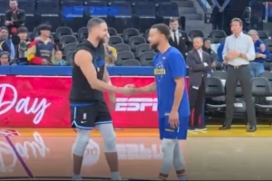 两人都笑得很开心!小吧现场直击:库里和克莱握手引发全场欢呼