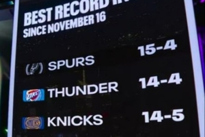 马刺主场迎战骑士,转播方晒出近一个半月(11月16日至今)的战绩排名: