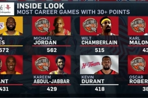 30+场次历史排名:詹姆斯572场第一 科比431场第五&KD418场第七