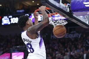 一气呵成!森萨博转身顶翻防守 起飞滑翔双手灌筐