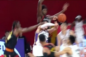 有点疼!廖三宁突破上篮被卡巴一巴掌打脸上 裁判回看后未升级