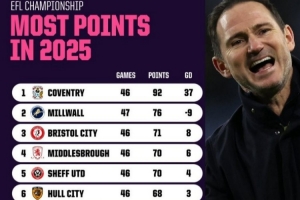体育资讯12月31日讯 数据网站OPTA盘点了2025全年英冠积分榜,其中兰帕德率领的考文垂积分92分,比排在次席的米尔沃尔多出16分,净胜球更是高达37球。