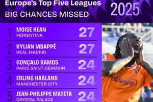 体育资讯1月1日讯 Squawka统计2025年五大联赛错失重大机会次数榜,基恩、姆巴佩以27次并列第一。