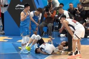周琦被撞飞后倒地误伤徐杰膝盖!徐杰头盖毛巾已被队友背下场!