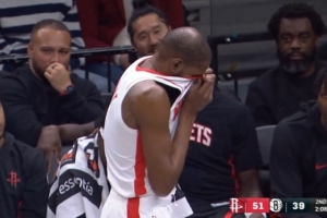 啥篮儿啊!沃尔夫投篮没碰筐 砸板弹到KD脸上&后者痛苦捂脸