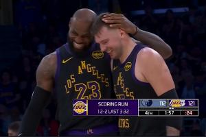 开心啦!詹姆斯上篮打停灰熊!大笑&单手搂着东契奇 轻拍后者脑袋