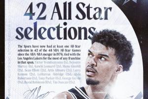 自1976年ABA和NBA合并以来的48次全明星赛中,马刺球员参加了42次,与湖人并列联盟最多。