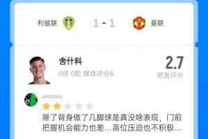 近期舍什科已经遭遇了9场进球荒,本赛季他加盟曼联后17场比赛仅打入两球,他的表现也遭到了球迷的口诛笔伐,本场比赛吧友给舍什科打出了2.7的超低分。