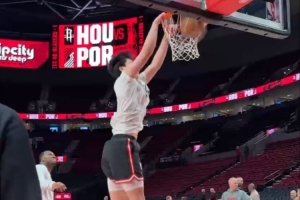 今天很有兴奋劲~杨瀚森赛前训练玩起了打板空接暴扣
