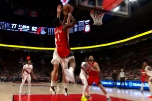 双脚都离地了!卡斯尔起跳落地裁判没吹 开拓者目送后者突破扣篮