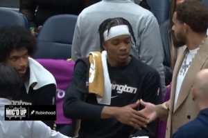 略显拘谨!比赛期间特雷·杨来到奇才替补席 和新队友打招呼