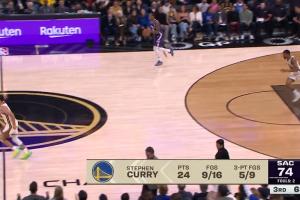 屁股老疼了!库里硬拔三分摔得四脚朝天 回头同一位置还能进!