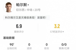 体育资讯2月15日讯 切尔西在本轮英超0-3不敌布莱顿,帕尔默本场数据如下: