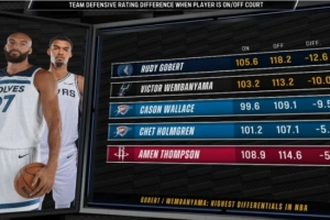 最强防守对决!戈贝尔防守效率差12.6第一&文班10.0紧随其后