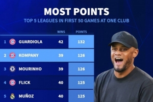 孔帕尼执教拜仁前50场联赛积126分,五大联赛历史仅次于瓜帅