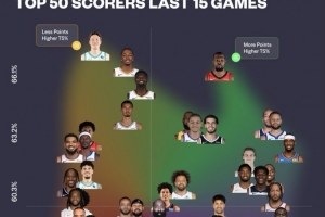 近15场球员得分产效:KD&库里&小卡高产高效 东契奇高产低效