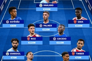 前锋:埃斯特旺(切尔西,8000万)、哈兰德(曼城,2亿)、萨卡(阿森纳,1.3亿)