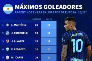 欧洲联赛阿根廷射手榜:劳塔罗14球居首,帕尼切利、小蜘蛛前三