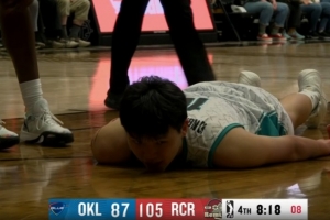 小防大!对手下三路使绊子对抗中放倒杨瀚森 后者趴在地上有点萌~