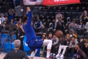 等等这是谁?赛前热身库里完成空接暴扣 惊呆场边“小学生”