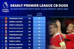 本世纪英超中卫组合零封:费迪南德&维迪奇最多,加布&萨利巴次席