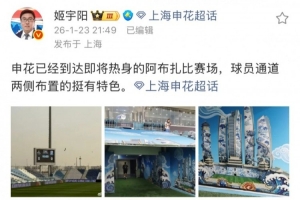 媒体人姬宇阳在社媒晒出了申花抵达热身赛场地的照片,以及申花主帅斯卢茨基和对方教练组寒暄的照片等,并配文写道:“申花已经到达即将热身的阿布扎比赛场,球员通道两侧布置的挺有特色。”