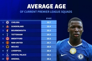 德转列英超各队平均年龄:切尔西23.7岁最小,富勒姆28.9岁最大